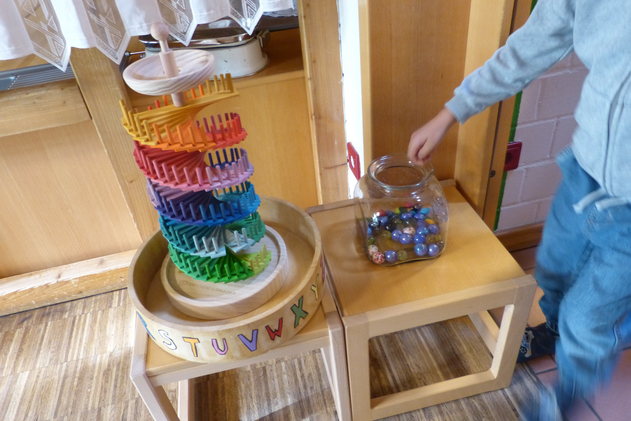 Jedes ankommende Kind nimmt eine Kugel aus dem Murmelglas. Es legt die Murmel oben auf den Kugelturm. So lange die Murmel die Bahn hinunterrollt, sucht sich das Kind einen Platz im Kreis.